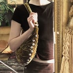 Sac en velours de soie brodé et plissé à la main. Clous argentés patinés sur le pourtour. Deux lanières réglables.